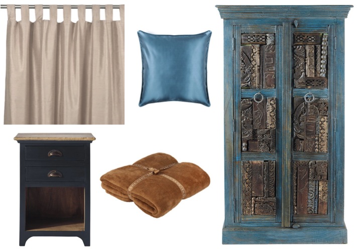 Silk curtains, silk duchess pillow and blanket Fleece Zara Home. Rideaux et coussin en soie, courverture vue à Zara Home. Closet Jodhpur et bedside table Maisons du monde. Armoire Jodhpur et chevet Maisons du monde.