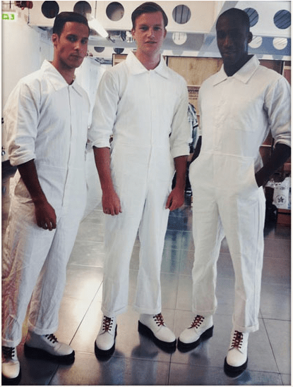 3 waiters at the ACNE fashion show (we would rather hire them as our personal shopping helpers: easily recognizable in the dark winter crowd, have an affinity for fashion, and can fight to get you the last pairs of 37,5). Picture of Jennifer Neyt seen on vogue.fr